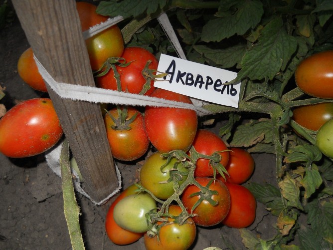- Акварелът се засажда извън оранжерията. Сортът е напълно непретенциозен и расте не повече от 100 см. Плододаването е добро, независимо от сезона, а доматите ще бъдат малки, сочни и сладки, идеални за консервиране и приготвяне на домашен сок.