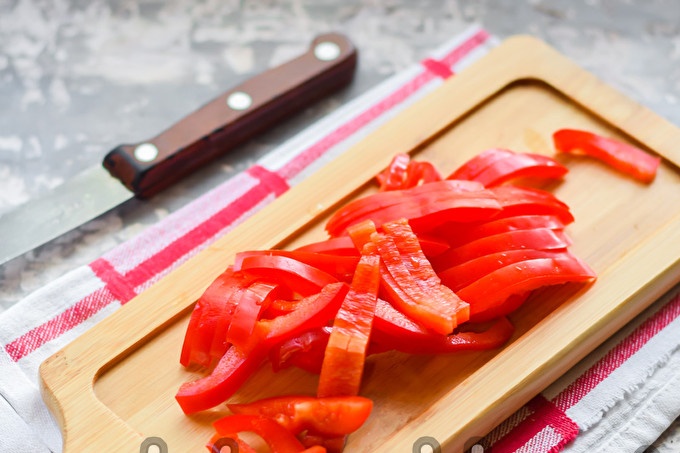 Измийте сладките чушки, след това нарежете наполовина и отстранете семената и вените. Нарежете пипер на ивици или на кубчета - както ви харесва най-добре.