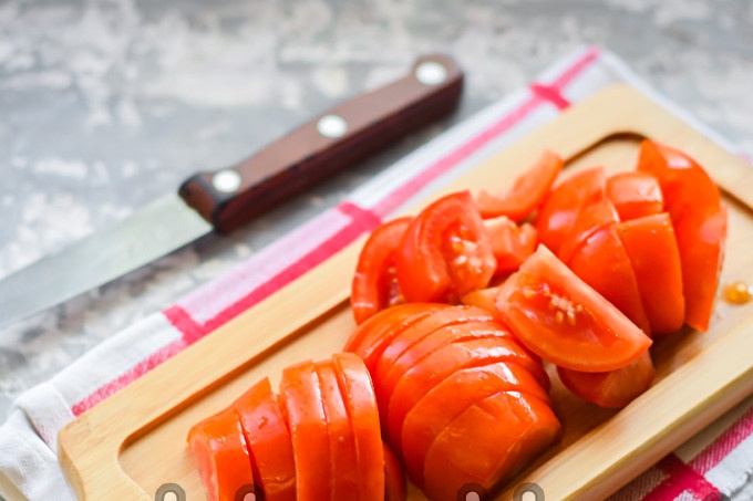 Измийте доматите, отрежете мястото на растеж на стъблото. Пропуснете килограм домати върху сокоизстисквачка, оставете оставете на филийки.