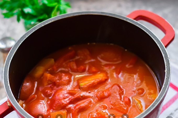 Изсипете доматен сок в тигана, добавете всички зеленчуци. Изсипете порция растително масло, добавете сол и захар.