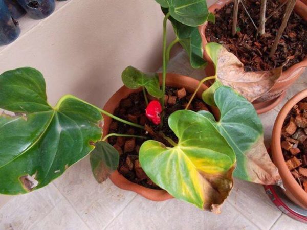 Доста често цветята се продават в кисела почва, може да се определи по цвят, обикновено той е червен и има влакнеста структура. Ако не се открият такива причини, е необходимо да върнете антуриума обратно в саксията.