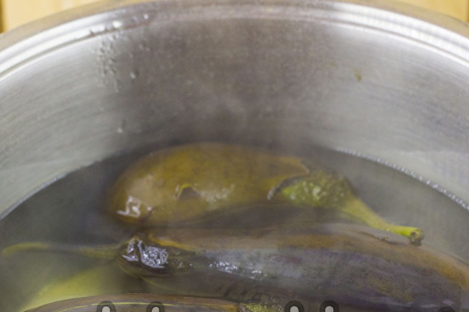 Предварително измитите и обелени патладжан се вари в подсолена вода. Сварете ги за 15 минути. Плодовете трябва да се използват млади, с приблизително еднакъв размер.