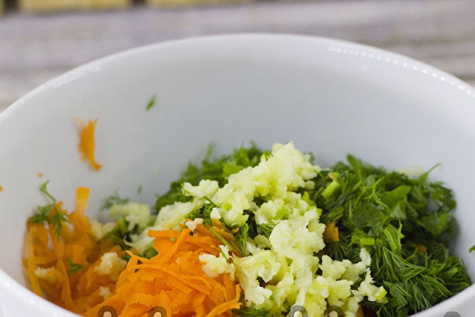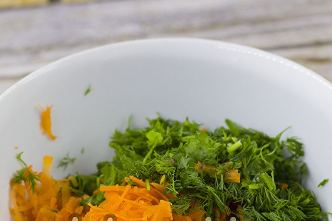 Настържете морковите, нарежете зелените. Препоръчва се да се използват пресни, сочни моркови, без повреди.