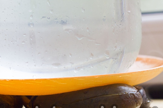 Нарежете охладения патладжан по дължина на две или три части, но не нарязвайте на стеблото. След това трябва да поставите зеленчуци под пресата поне за час. Това ще помогне да се отървете патладжана от излишната горчивина и влага.