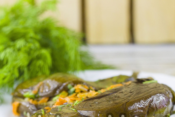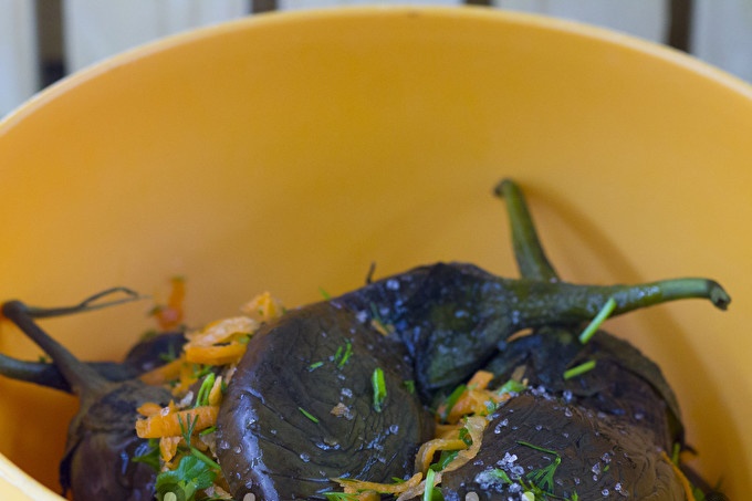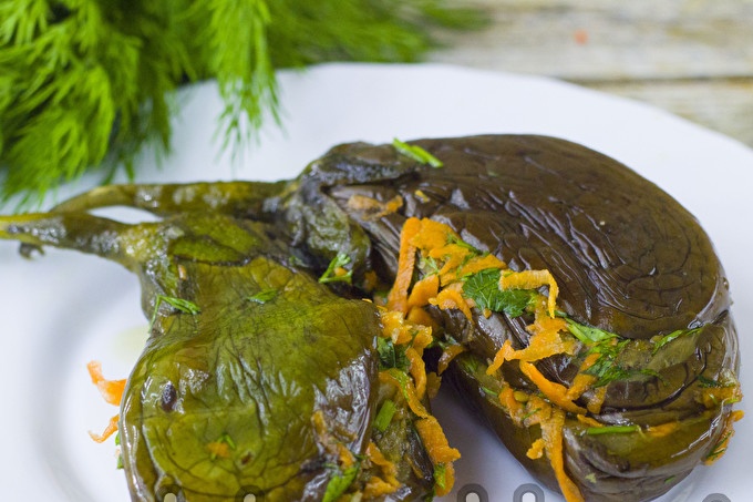 Пикантни ферментирали патладжани с моркови, билки и чесън