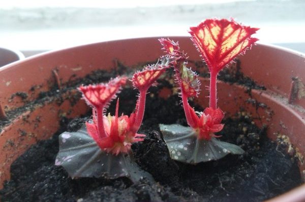 Необходимо е да се премахне прозрачният подслон след появата на кълнове и да се потопите в отделни саксии - когато разсадът от бегония придобие 3-4 листа.