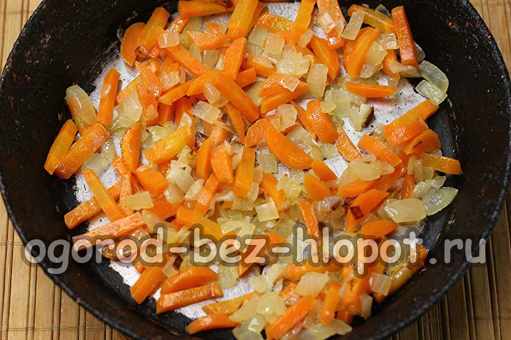 На следващата горелка приготвяме зеленчукова пърженица за дресиране на борш. Първо предаваме ситно нарязания лук до полупрозрачност, добавяме към него моркови, нарязани на тънки ивици. Разбъркайте, продължете да къкри зеленчуците за още две до три минути.