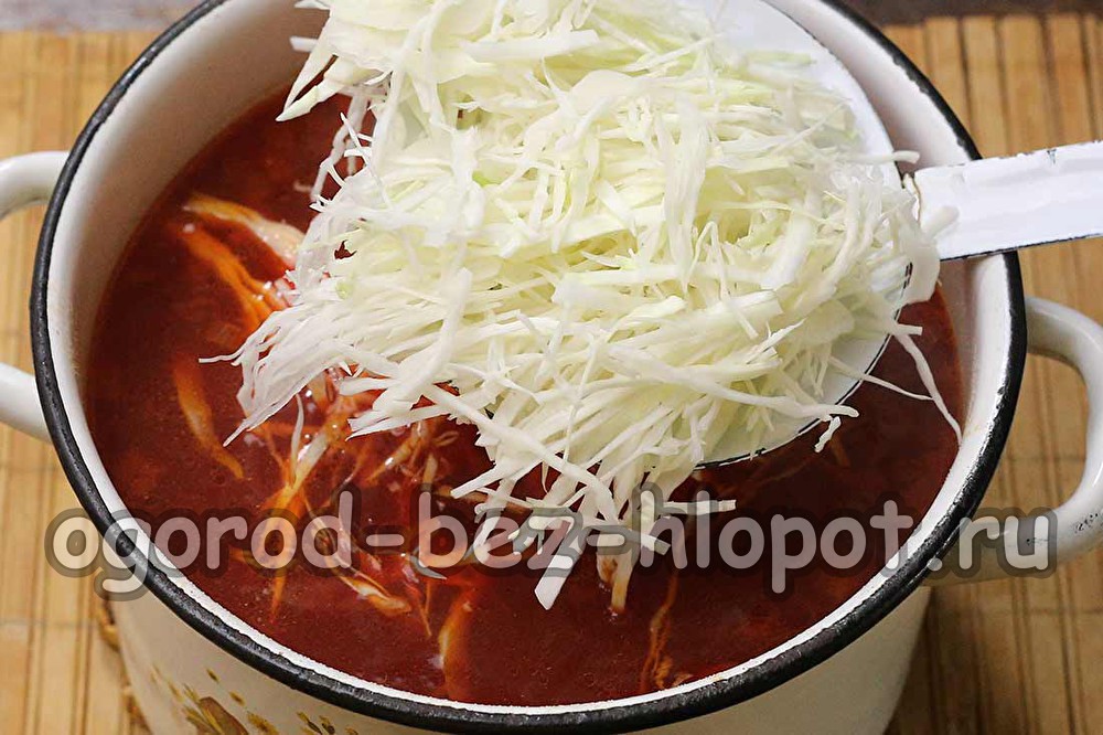 Настържете зелето с къса сламка. Добавете към борша, добавете сол. На слаб огън гответе борш, докато зелето е готово. Можете да го оставите хрупкав на пода или да готвите до омекване - гответе както искате.