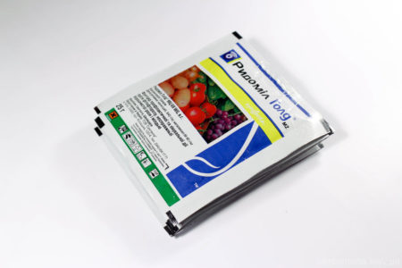 Лекарството Ridomil се използва за профилактика и лечение на късен блясък, черно гниене, мухъл, сива петна и рубеола. Състои се от две активни вещества: манкозеб (640 g / kg) има контактен ефект и когато попадне в растение, унищожава външните гъбични колонии; менофикс (40 г / кг) прониква в лозата и я предпазва отвътре. Защитните свойства на лекарството остават в продължение на две седмици, дори когато настъпи дъждовно време.