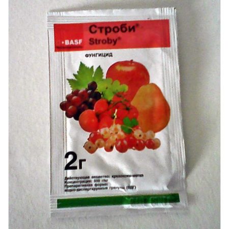 Strobi ефективно се бори с почти всички гъбични заболявания. Като част от лекарството се използва активното вещество крезоксим-метил. Фунгицидът се предлага в гранули, опаковани в опаковки от 2 или 200 грама. След прилагането на Strobi се прилепва към листа и плодове, образувайки защитен филм, който унищожава спорите на мицела. Лекарството е устойчиво на валежи и затова е възможно да се работи с него дори при дъждовно време.