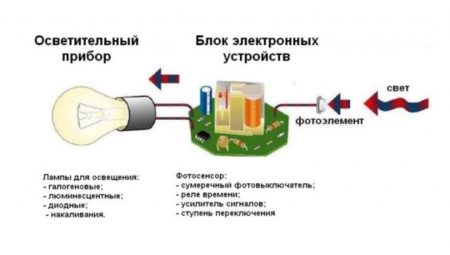 Тази работа зависи от фоточувствителния елемент. Интензивността на осветлението се променя през целия ден. Това явление допринася за промяна в проводимостта на тока на фотоклетката. По правило това е фототранзистор или фотодиод. Основното устройство на устройството се управлява от специална контролна платка. Допринася за факта, че окабеляването на електрическата верига е затворено.