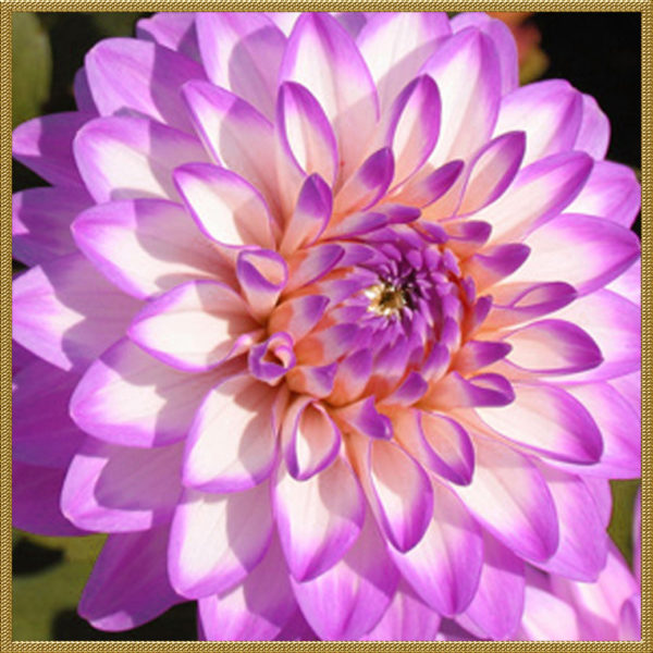 - Dahlia border Melody Dixie, способен да украси цветно легло дори с буйната си зеленина, но е особено привлекателен, когато е обсипан с бяло-лилави цветя с плътно прилепнали венчелистчета.