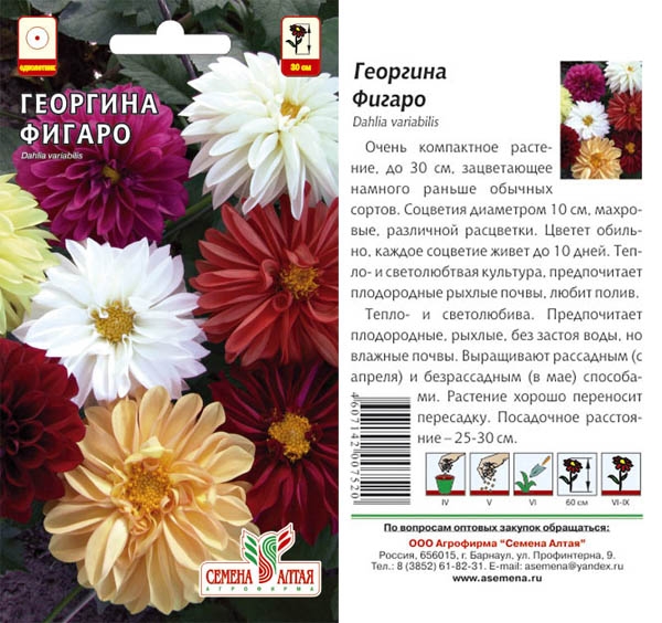 Далия Фигаро е годишен сорт. Фигаро дали и тяхното отглеждане на семена се извършва от градинари по време на отглеждане на растения. През есента семенният материал се събира и обработва. Необходимо е правилното съхранение. През пролетта засаждането се извършва в саксия, след което се прехвърля в цветни лехи. Разсадът изисква добър дренаж. Основата на почвата се състои от смес от торф и хумус. Добавят се малко пясък и дървесна пепел.