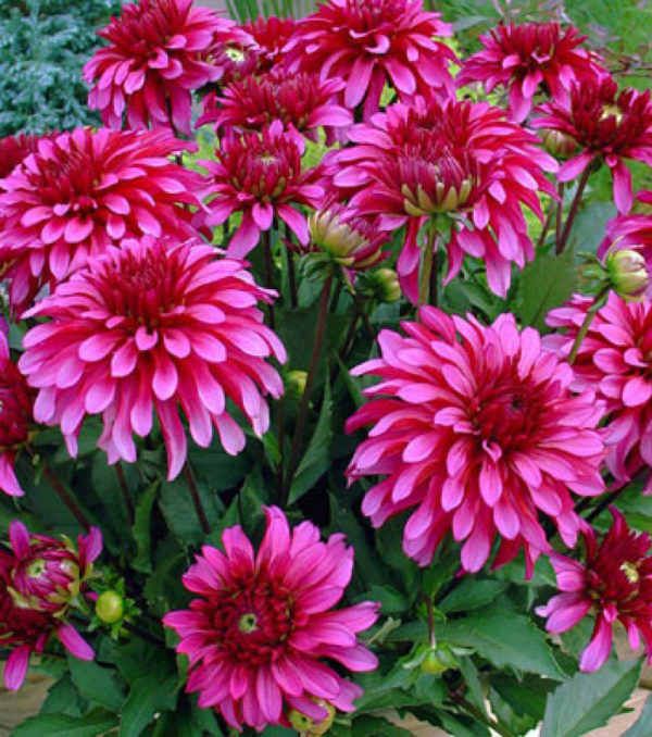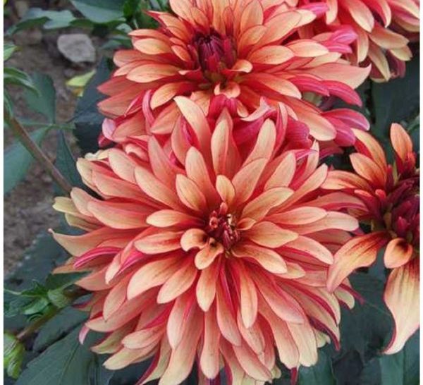 - Арт Деко. Оранжево-тухлени цветя с червеникав оттенък са с диаметър 15 см. Много декоративна гранична далия. До 40 см височина.