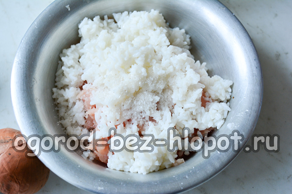 Сварете ориза за 15 минути. Тя трябва да е леко сварена. Сложете сварен ориз в гевгир и го изплакнете с вода. Прехвърлете измития ориз върху каймата. Добавете сол и, ако искате, смлян черен пипер.