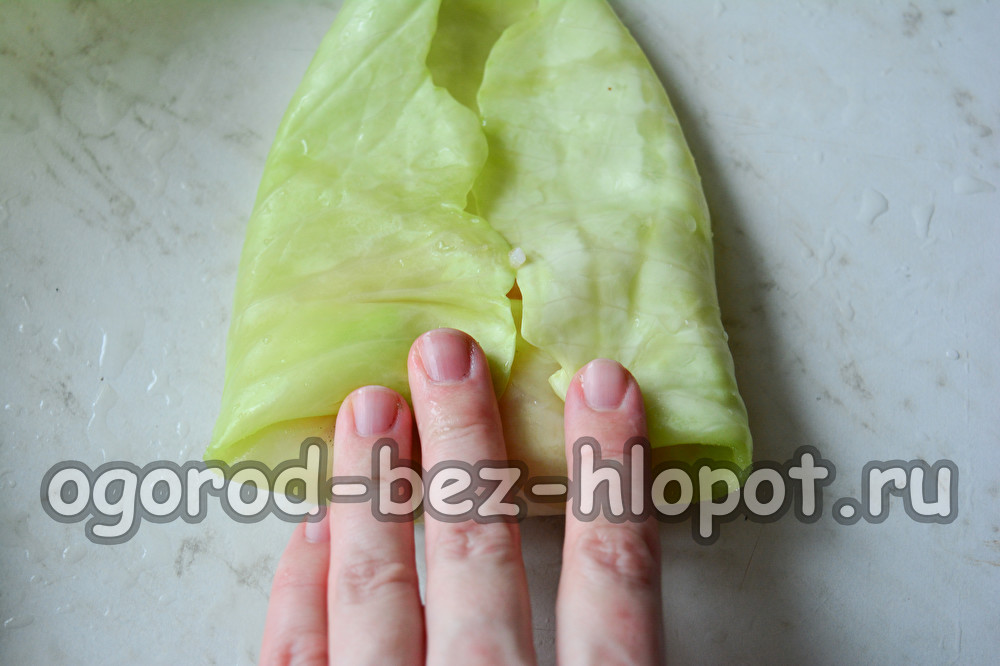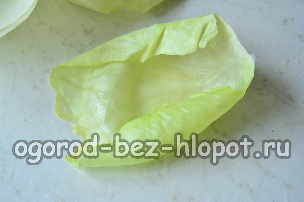 Долейте вода до кипене в голяма тенджера (изсипете малко по-малко от половината). Поставете глава от зеле във водата. Гответе го буквално за 1-2 минути. След това внимателно извадете зеленчука от водата, сложете го на масата и отстранете горните меки листа, като внимавате да не ги разкъсате.