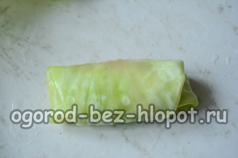 Поставете каймата с ориз върху единия ръб на зелевия лист. Сгънете зелевия лист първо в центъра, след това сгънете краищата и след това го навийте на руло. Така направете и останалите листове.