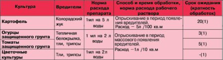 Ефективността ще се увеличи, когато валежите не се утаяват след напояване, което може да промие продукта и да намали вероятността от защитния му ефект върху реколтата. Ако се обработят растения като ябълка, дюля или круша, третирането се извършва 10 дни след цъфтежа на културата. След 14 дни, ако е необходимо, пръскането се повтаря. Използването на лекарството върху едно растение за единствения вегетационен период на развитие повече от три пъти е строго забранено. Това може да предизвика пристрастяване при вредители и да намали ефективността на действието. В идеалния случай продуктът се редува с други инсектициди.