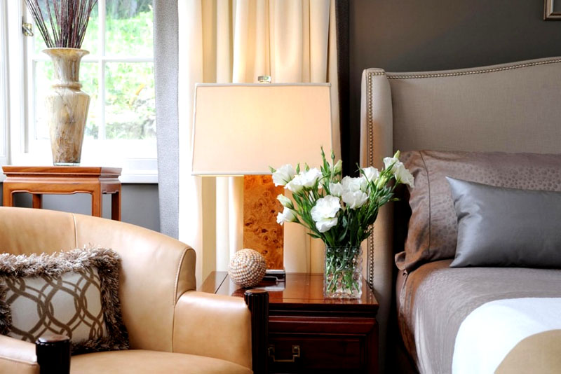 - Спалня: малки букети, топки за маса, оригинален панел на стената.