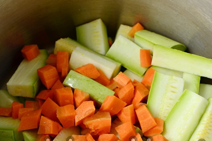 Обелете морковите и нарежете на средно големи кубчета. При приготвянето на тази закуска, основното е да не нарежете зеленчуците прекалено фино.