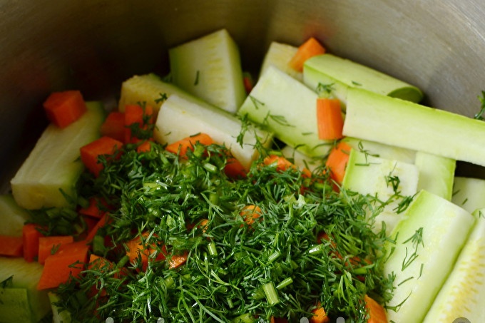 Плодовете на тиквичката се измиват и се нарязват на средни барове. За този препарат е по-добре да изберете млади тиквички, с тънка кожа. Не е необходимо да се отстранява, отрязваме само опашките и стеблата.