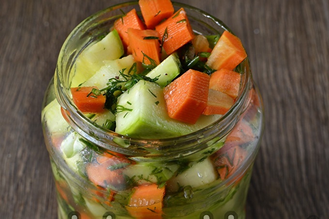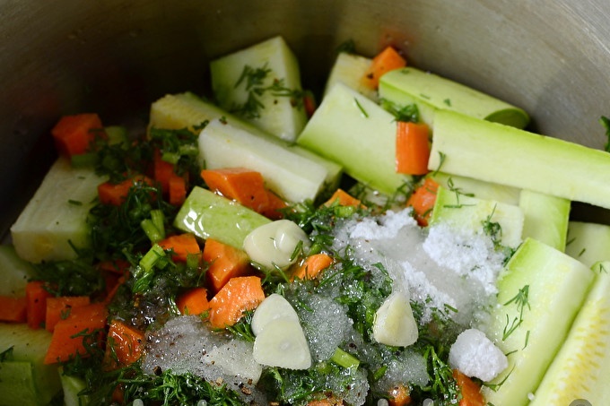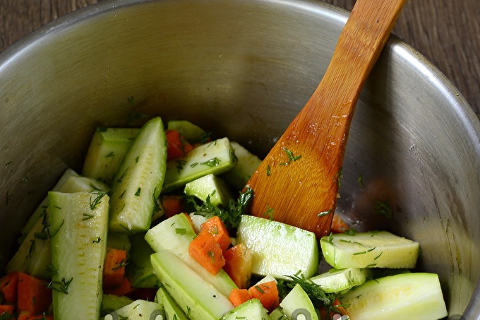 Разбъркайте добре мезето и забравете за него в продължение на три часа, така че зеленчуците да са достатъчно наситени с подправки и да дадат течност.