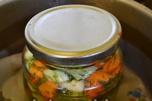 Стерилизираме в тенджера, с покрито дъно за 20 минути и навиваме капаците.