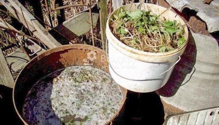 В кофата с вода поставете останалия хляб, киселото мляко. Нежелано захаросано сладко, което е. След това там изпратете пакет от 10 г суха мая и чаша пепел. Смесваме всичко и оставяме на топло за една седмица. Не забравяйте да смесвате ежедневно. След седмица всичко е готово, можете да го извадите и да го поставите под храстите, да поливате останалата каша. Можете също така да разреждате кваса 1: 3 с топла вода и да изсипвате 250 г разтвор под всеки храст.