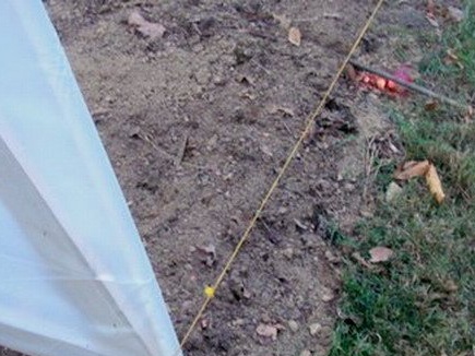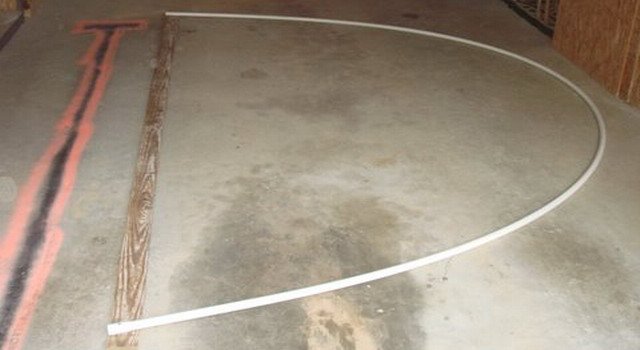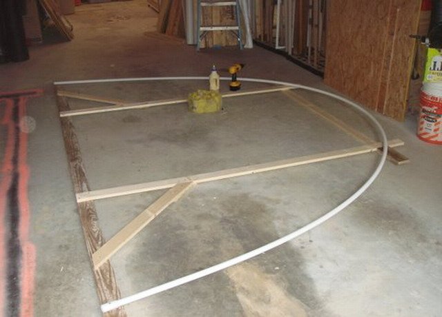 - Определя се контурът на оранжерията, прикрепете временно към нея парче PVC тръба и дървени дъски.