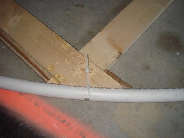 - Сега извадете тръбата и отпилете излишните парчета от рамката, които вече ще се виждат в зависимост от нанесения контур. Поставете пластмасовата тръба отново, но отвън на нейното постоянно място. За това се използват самонарезни винтове заедно с телени котви.