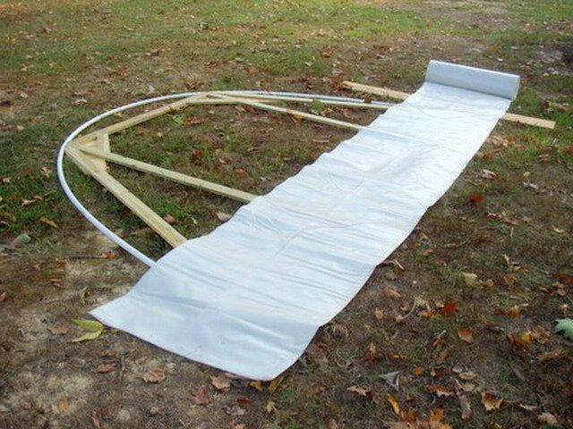 - Гребен, идващ от дебела тръба, е монтиран в самия връх на рамката. Това ще ви позволи да разтегнете филма колкото е възможно повече и той определено няма да провисне. Прикрепете страничните ребра към това било и за вярност допълнително закрепете конструкцията с въже.