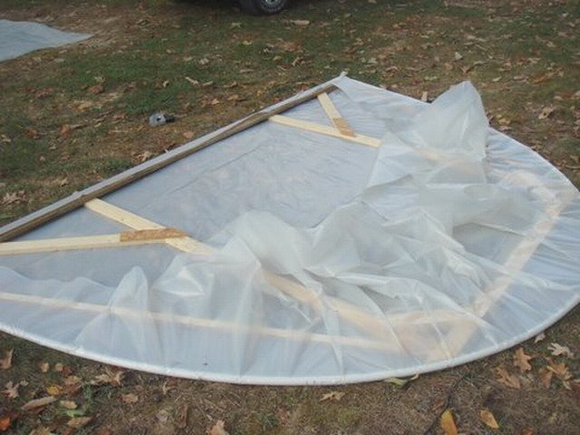 - Остава да направим задните и предните крайни стени на оранжерията.Като основен материал за покритие в този вариант на конструкцията се използва филм. Тя може да бъде прикрепена към конструкцията в самия край на конструкцията. Важно е да се уверите, че рамката се състои от достатъчен брой дървени елементи, в противен случай, тогава ще има трудности с фиксирането на филма (той може да провисне, да слезе при силен вятър).