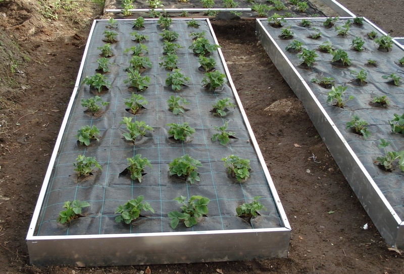 Второ, постепенно трансплантирайте всички ягоди в черен агроспан мулч с плътност 60 g / кв.м. Това покритие издържа поне 5 години. Трябва да кажа, че не е имало прегряване на почвата под него дори в жегата и има много плюсове: лесно се отстраняват мустаците, плодовете са чисти, няма плевели, броят на поливанията е намалял.