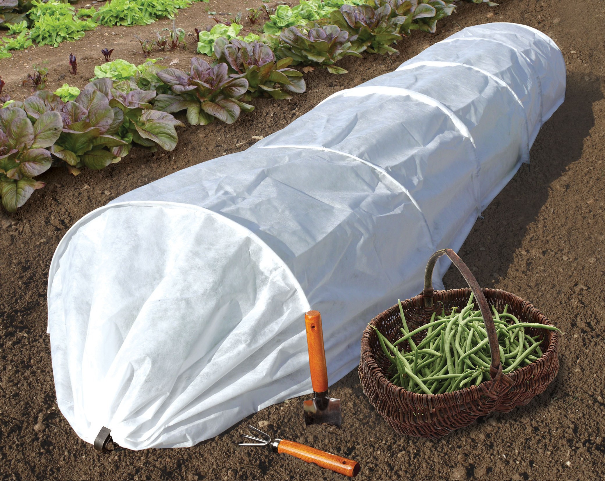 Бял покривен материал се използва за покриване на растения отгоре от температурни крайности и студ в началото на сезона на засаждане на разсад.