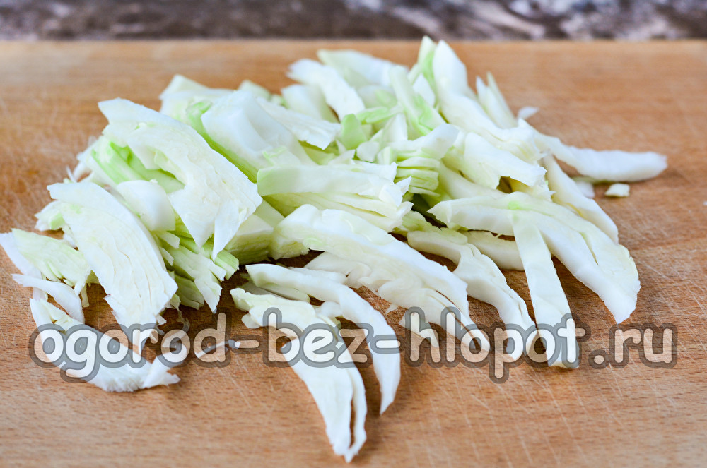 Отстранете горните листа от зелето, след което зеленчука нарежете на ивици. Зелето може да се нарязва с остър нож или да се използва специален ренде.