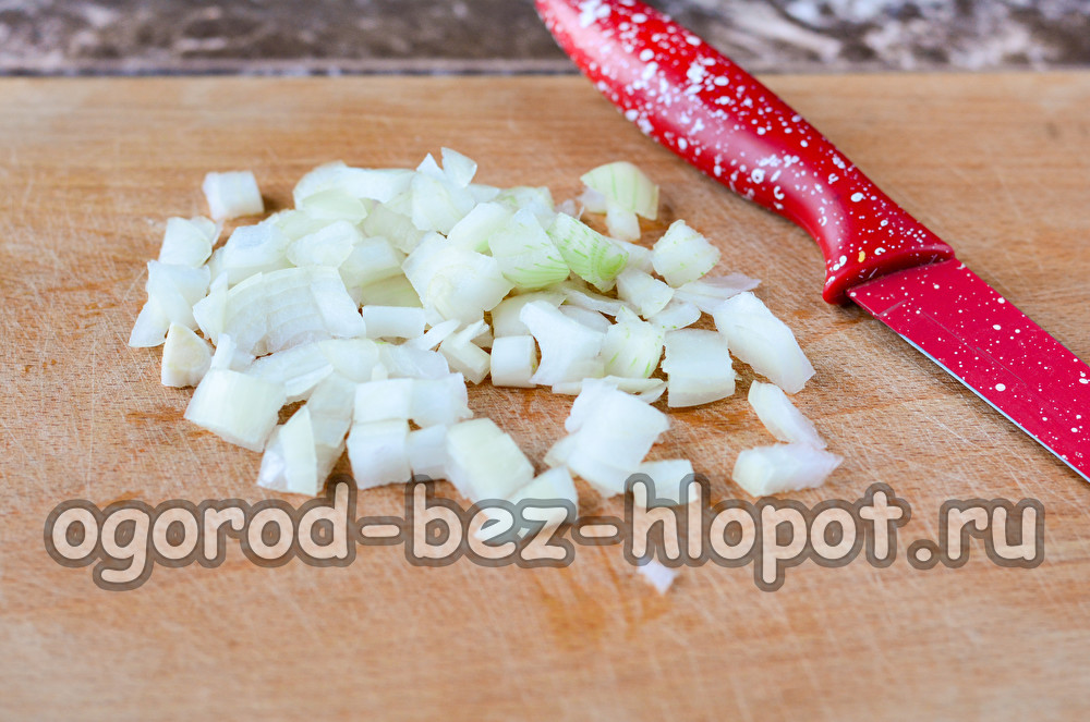 Обелете лука от люспите, изплакнете под вода, след което нарежете на малки кубчета.