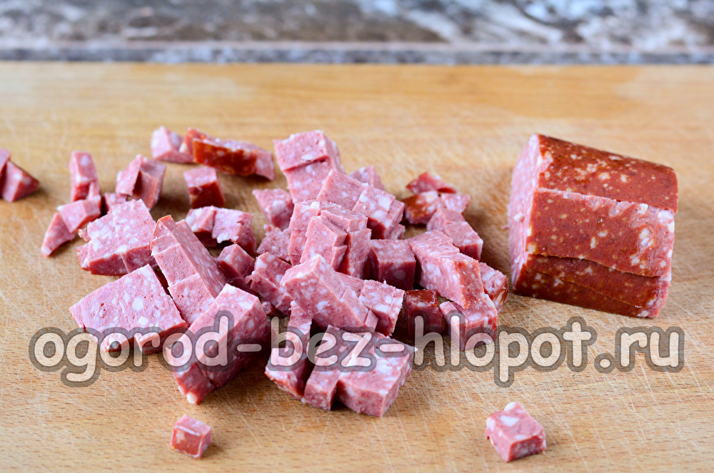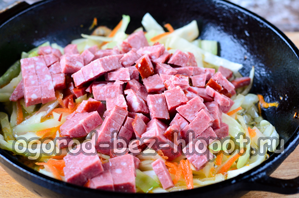 Докато зелето се пържи, нарязайте пушен наденица на кубчета. Колбасът може да бъде полупушен или сушен - каквото предпочитате.