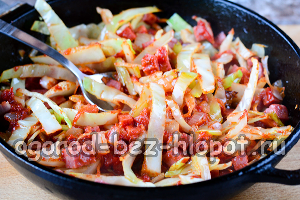 Когато зелето стане наполовина меко, добавете колбаса в тигана, разбъркайте и запържете малко, така че наденицата да излъчи ароматите си.