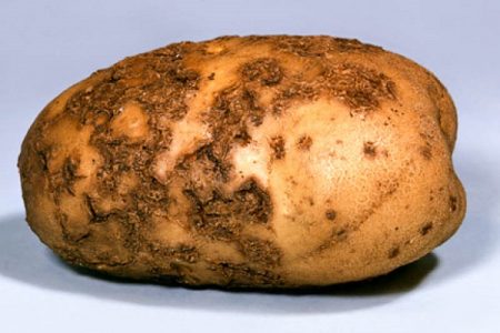 гангрена гангрена, Болно растение може лесно да се идентифицира по удължено петно, което започва върху листния дръжка и след това преминава към стъблото. Засегнатите части на стъблото умират, спорите на гъбичките попадат в почвата. По клубените се появяват гнилостни тъмни петна. За превантивни цели засаждането на картофи три седмици след покълването се третира с препарати Ширлан или Танос. По време на цъфтежа растенията използват фунгицид "Ridomil Gold MC."