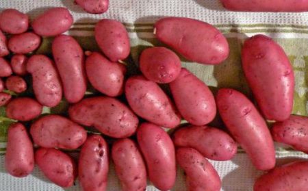 Картофи Червено червено има удължени овални грудки, покрити с тънка кожа на розово, понякога малина. Кората е кадифена на пипане. Очите на това картофени сортове почти незабележим, жълтеникав, много малък. Дори изглежда, че грудките са просто абсолютно гладки и нямат тези съществени вегетативни признаци на картофите. Ако кълновете от очите покълнат, тогава те имат леко лилав оттенък.