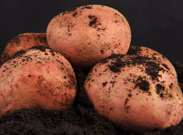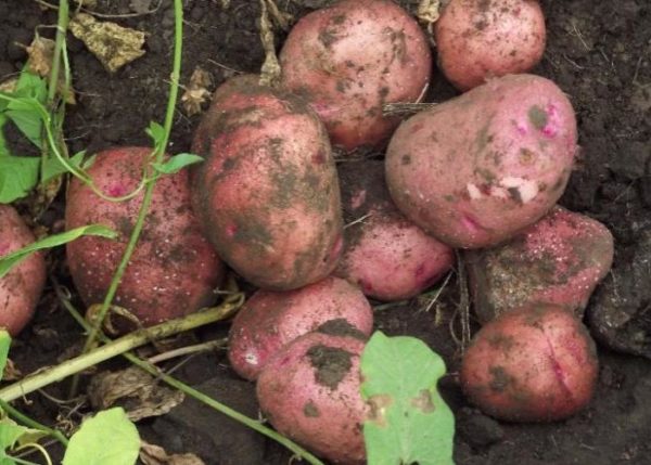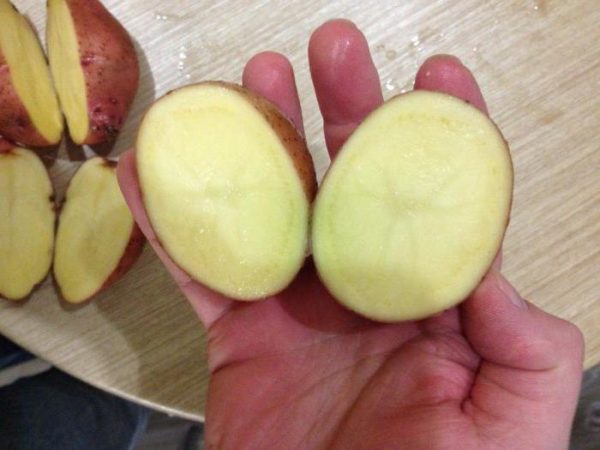 При събиране на картофи един храст може да съдържа 15-20 големи или средни грудки. По външни признаци те са кръгли или леко удължени, цветът е от розов до червеникав. Плътна кора със средна дебелина.Повърхността често е хълмиста или гладка с малка мрежа и равномерно разположени очи. Вътре зеленчукът е светло жълт, което ви позволява да усвоите добре, но не и да се превърнете в каша. Това се дължи на високата стойност на нишестето. В една грудка съдържанието му може да достигне до 20% или повече.
