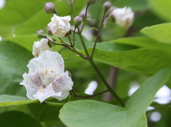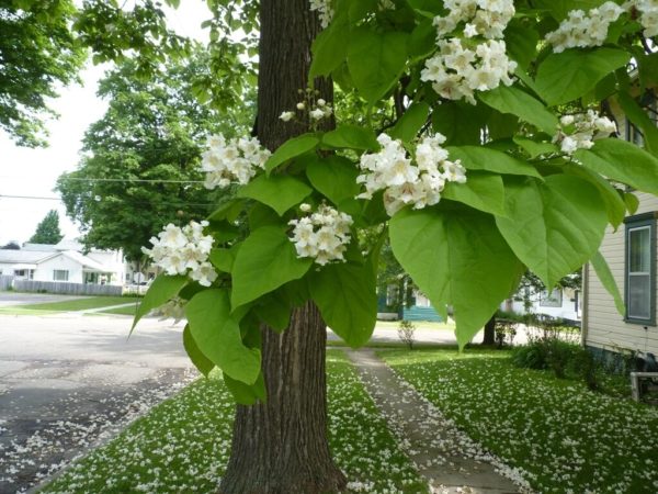Дървото каталпа не изисква специално внимание, за да цъфти.По време на пълен цъфтеж растението изглежда много привлекателно. Цветята имат бял или бежов оттенък.