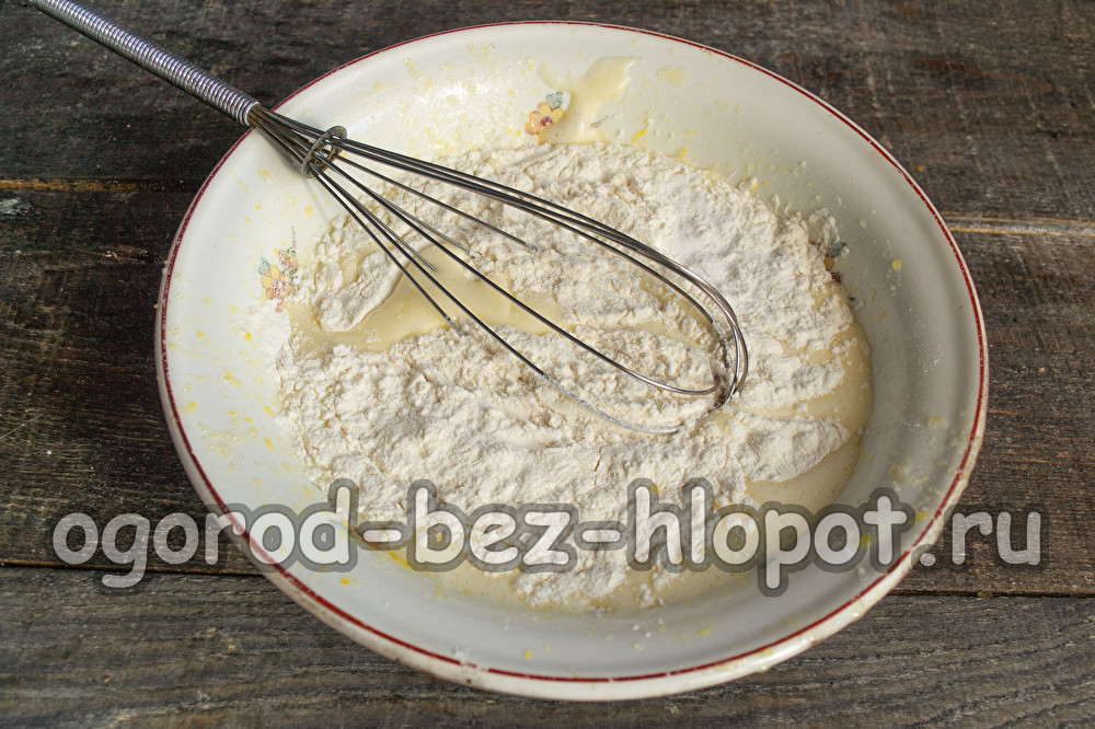 Измерваме точното количество пшенично брашно, добавяме бакпулвера на тестото. Пресейте брашното с бакпулвера през сито, след което смесете брашното в яйчно-захарна смес на малки порции, омесете тестото с нежни, равномерни движения.