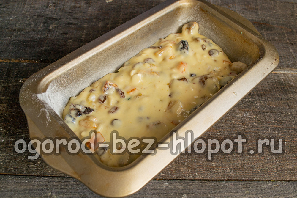 Вземете смес от ядки, сушени плодове и захаросани плодове. Ако е необходимо, нарежете по-малки големи съставки от тази смес (големи захаросани плодове, ядки или цели смокини), добавете сладкиши в купата с тестото, разбъркайте внимателно.