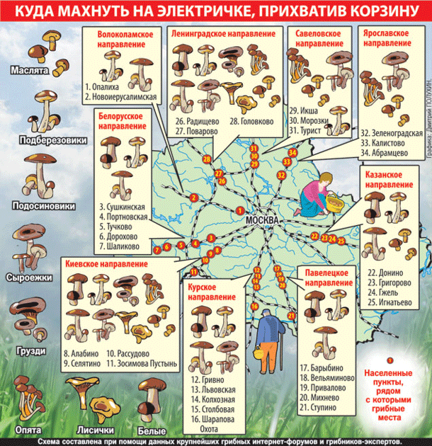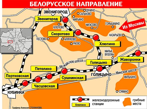 Гъби места близо до Москва на картата 2017 с кола и влак