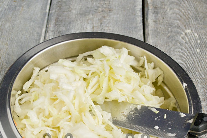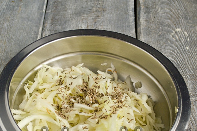 След това сложете нарязано зеле в купа, изсипете цялата сол, разтрийте я с ръце, докато сокът изпъкне. В резултат обемът, зает от нарязаното зеле, ще намалее няколко пъти.