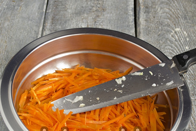 Почистваме морковите със стъргалка за зеленчуци, старателно изплакваме със студена вода, нарязваме на ивици или разтриваме на голяма зеленчукова ренде.