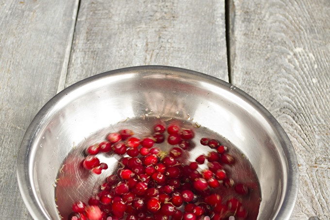 Накиснете пресни боровинки в студена вода, изплакнете обилно, отстранете отломките и сушените плодове.