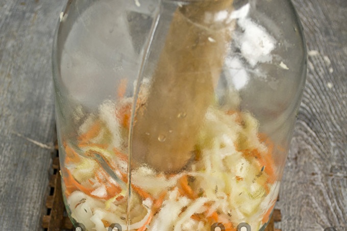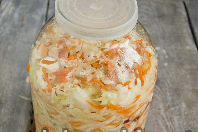 Покриваме буркана с капак, за да не попаднат случайно прах и отпадъци в туршията. Оставете буркана на стайна температура за 5-7 дни. Времето на ферментация зависи от температурата в помещението, обикновено + 20-22 градуса по Целзий.