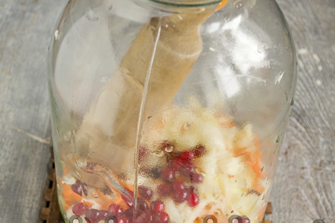 След това изсипете малко червени боровинки, отново сложете настърганите зеленчуци, стегнете. По този начин пълним буркана почти до самия връх.